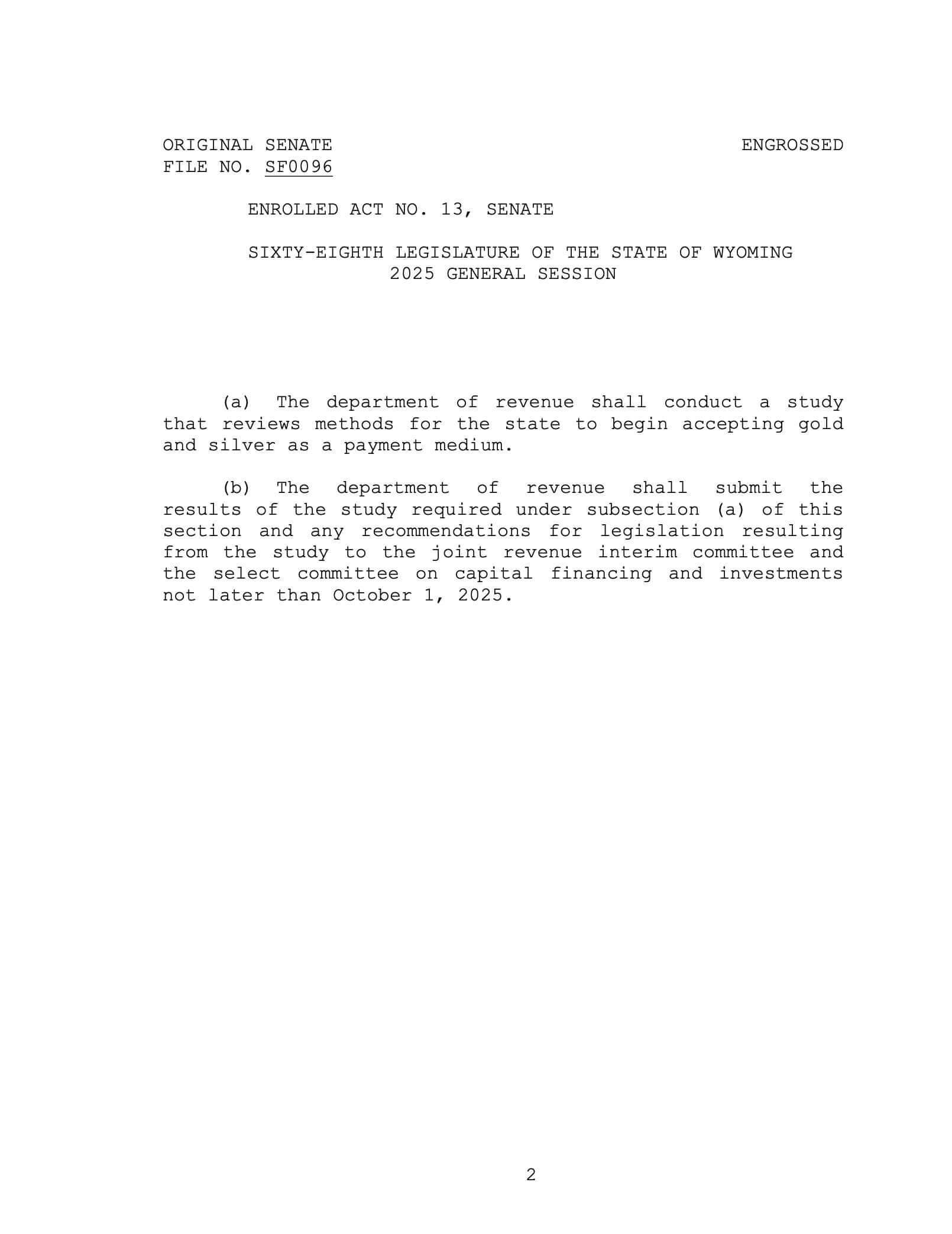 Beyond establishing a physical gold reserve, the legislation directs the Wyoming Department of Revenue to conduct a comprehensive study on methods for the state to begin accepting gold and silver as payment mediums. The department must submit its findings and any recommendations for further legislation to the joint revenue interim committee and the select committee on capital financing and investments by October 1, 2025.
