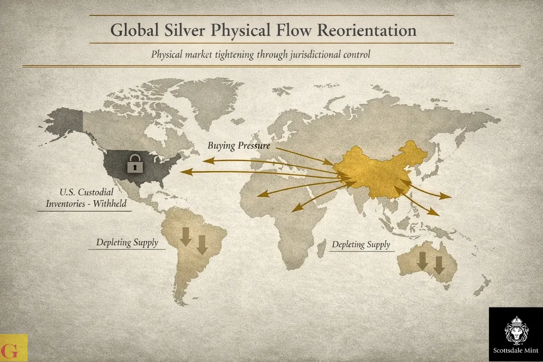Phair traces the present tightening phase back to the period surrounding Thanksgiving. He believes a large Chinese attempt to source substantial quantities of U.S.-held silver was redirected away from American custodial inventories. According to his interpretation, alternative sourcing was offered instead.
