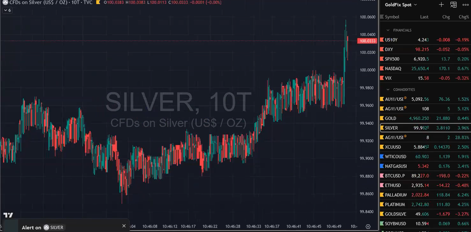 The move capped a methodical but increasingly energetic four-day advance. Shortly after midnight, silver printed a high of $99.37, before pulling back in an orderly retracement to $97.75. From there, the market stabilized, regained momentum, and resumed its climb. At 10:47, silver touched $100, marking a historic moment for the metal.