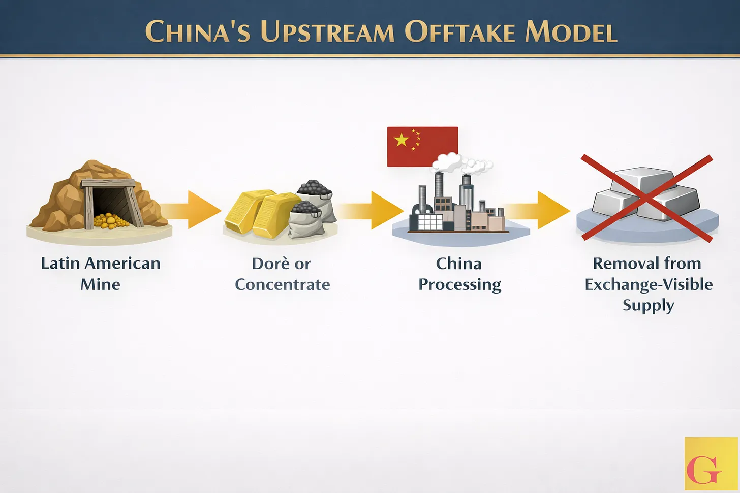 Latin American mine → concentrate or doré → Chinese processing → removal from exchange-visible supply.