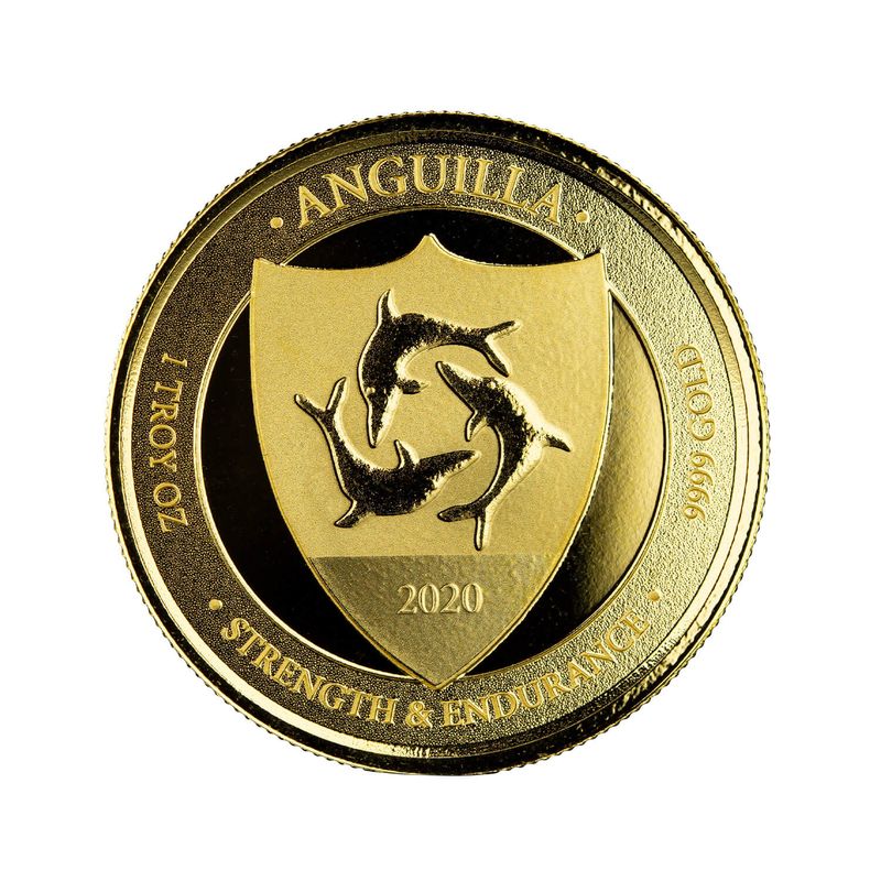 The 2020 EC8 Anguilla coin proudly displays the island nation's Coat of Arms, which is also the emblem found on the flag of Anguilla, a traditional symbol of the territory. The coat of arms consists of three dolphins leaping over the sea.