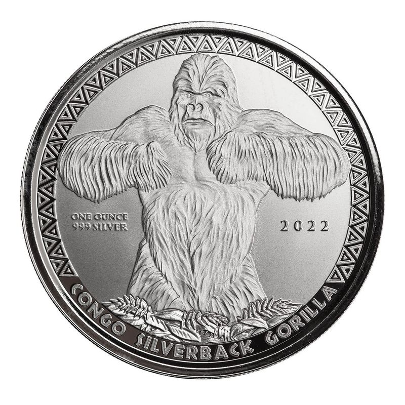 The silverback gorilla coin was first minted in 2015 by Scottsdale Mint. The reverse of the coin always features a portrait of a silverback gorilla in varying poses or styles, while the reverse shows the coat of arms of the Congo. The coin is made of .999 fine silver and has a mintage limit of 75,000 pieces.