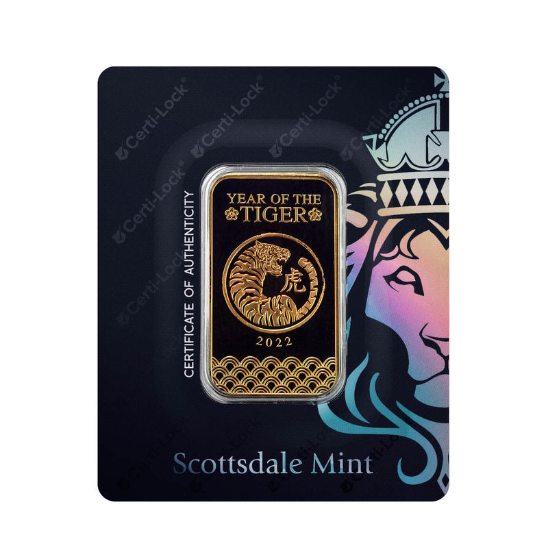 Give good luck with the latest Lunar Tiger Gold Bar from Scottsdale Mint! Each Gold Tiger Bar is sealed in a Certi-Lock assay card and assigned a unique set of authenticity credentials designed to give you more confidence when you sell, in any market. 1 Troy Ounce of .9999 Fine Gold. LBMA & ISO 9001-2015.