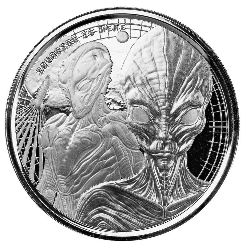 Now in its third year, get ready for an otherworldly adventure with our stunning alien series, titled "Invasion is Here." This extraordinary coin showcases two formidable aliens, one clad in battle gear, preparing to board their rocket ship and embark on an interstellar journey.