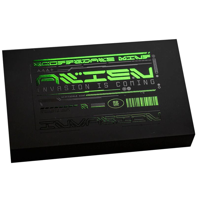 Now in its third year, get ready for an otherworldly adventure with our stunning alien series, titled "Invasion is Here." This extraordinary coin showcases two formidable aliens, one clad in battle gear, preparing to board their rocket ship and embark on an interstellar journey.
