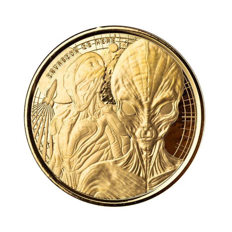 Now in its third year, get ready for an otherworldly adventure with our stunning alien series, titled "Invasion is Here." This extraordinary coin showcases two formidable aliens, one clad in battle gear, preparing to board their rocket ship and embark on an interstellar journey.