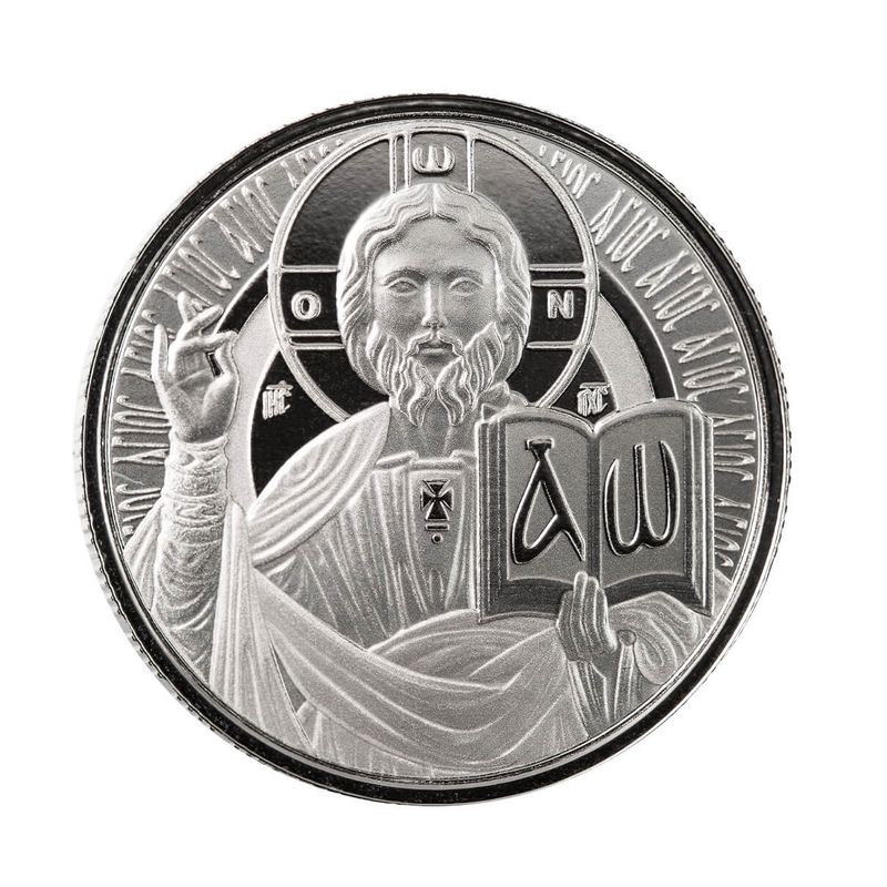 The coin features intricate details, with the word "HOLY - - Ⲁⲅⲓⲟⲥ - - AGIOS" inscribed. Notably, the Christ halo bears the meaningful inscription ⲞⲰⲚ, signifying "THE Being." Positioned beside Christ, the initials of his name are delicately rendered: ⲒⲎⲤ for Jesus and ⲠⲬⲤ for Christ. Additionally, the Bible on the coin is adorned with the symbolic representation of the Alpha and the Omega.