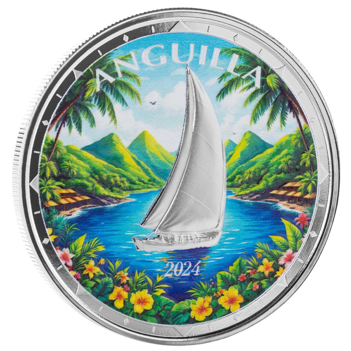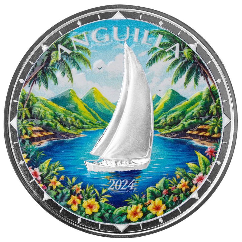 Glide into the heart of the Caribbean with a design that captures the quiet strength and enduring beauty of Anguilla’s nautical legacy. At its center is a single ship, alone on the open water, its sail full of wind, its course steady—an image that speaks to generations of craftsmanship, courage, and connection to the sea.