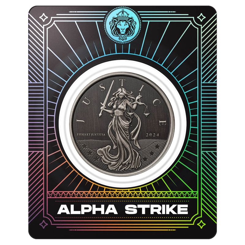 The coin's obverse features Lady Justice, blindfolded, holding a sword in her right hand and scales in her left, with the Latin phrase "fides et justitia." The reverse showcases the Gibraltar Coat of Arms, along with weight, purity, content, and denomination
