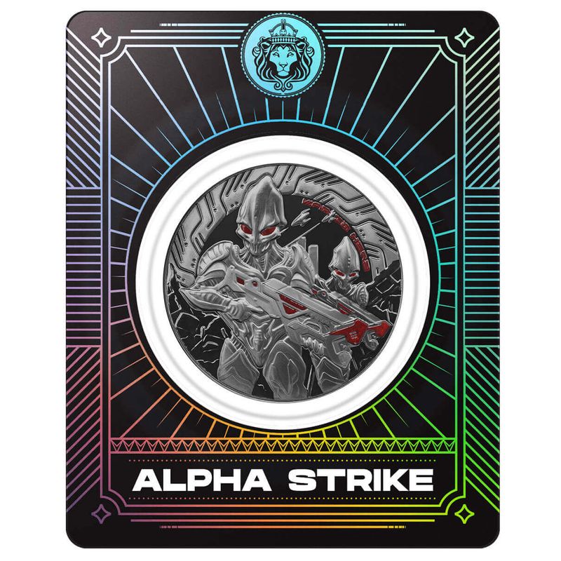 The 2024 Alien Battle coin series takes you deeper into the heart of an intergalactic conflict with its striking new design. This year’s coin features two armored alien warriors, one wielding a charge gun, ready for combat, while the other stands ready in the background. Together, they represent a fierce battle for dominance, their elaborate battle gear hinting at the high stakes of their mission. This thrilling depiction sets the stage for an epic confrontation beyond the stars.
