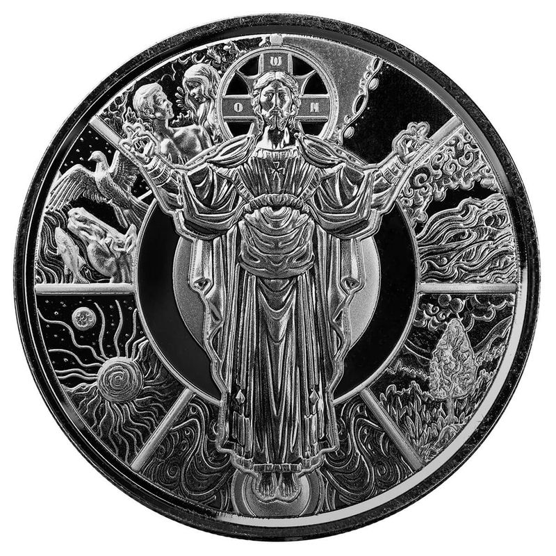 The design is further enriched with the inscription “HOLY - - Ⲁⲅⲓⲟⲥ - - AGIOS,” a testament to the sacredness of the act of creation. The coin also features the Alpha and Omega, symbolizing the eternal nature of Christ, the beginning and the end, through whom all was made. A radiant Christ halo bears the inscription ⲞⲰⲚ, signifying "THE Being," affirming that He is the source and sustainer of all creation.