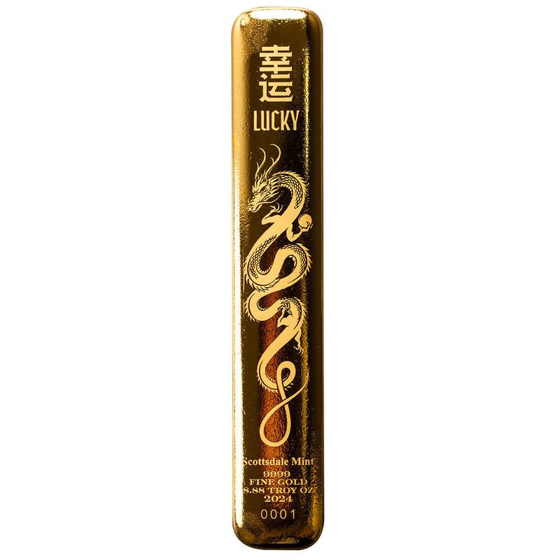 Each Gold Lucky Dragon Bar is meticulously minted using .9999 fine gold, ensuring the highest level of purity and quality and is serialized to ensure its uniqueness. The bar's substantial weight of 8.88 troy ounces not only makes it a coveted addition to any precious metals collection but also adds a layer of cultural significance, as the number 8 is often associated with great fortune, wealth and spiritual enlightenment. Hence, 888 is considered triple fortune.