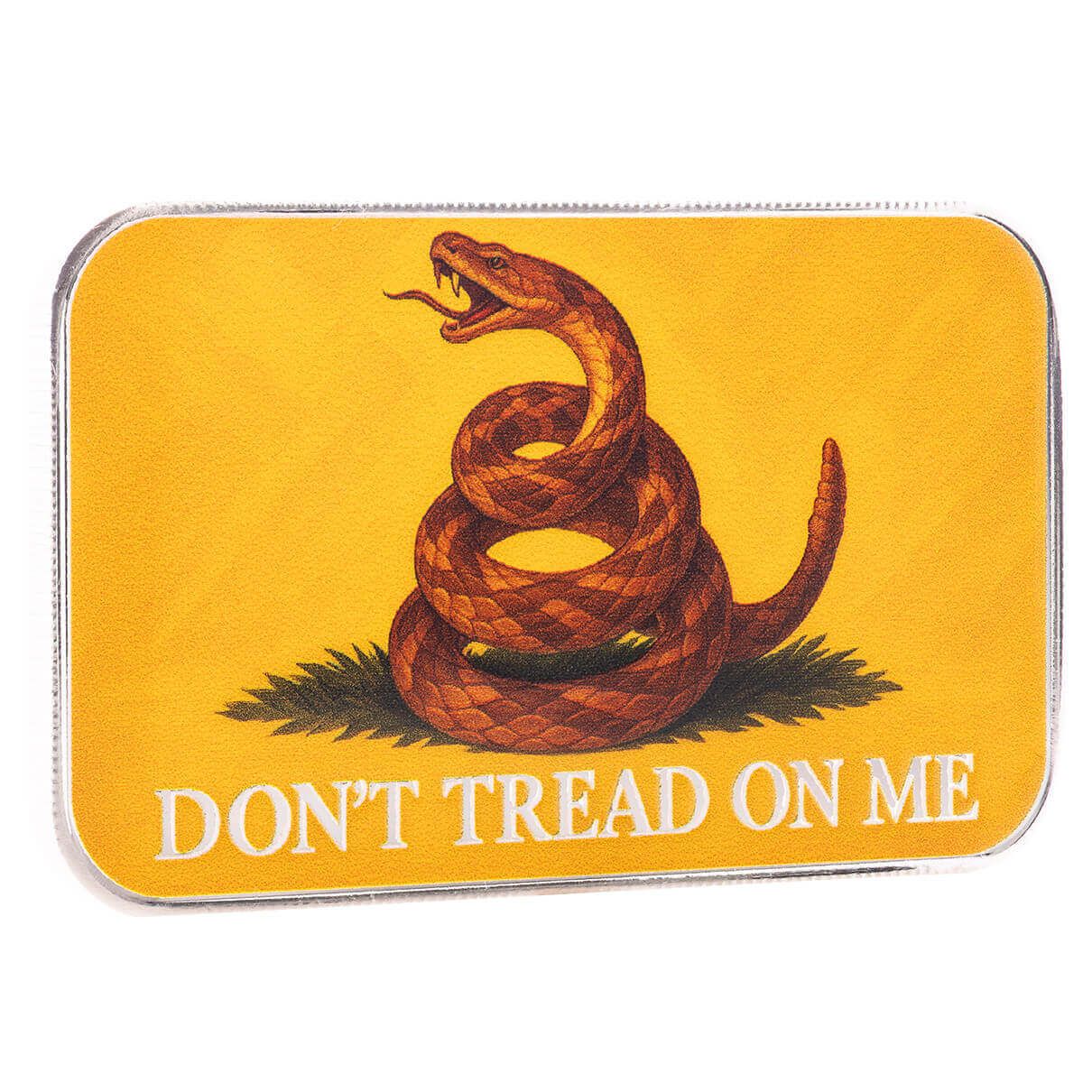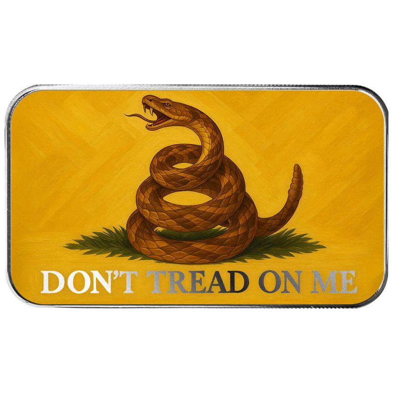 In classic yellow, this silver bar brings the Gadsden flag roaring to life with its coiled rattlesnake ready to strike. The historic slogan “Don’t Tread on Me” takes center stage—loud, proud, and defiant. Rooted in Revolutionary War resistance, the design remains a powerful statement of liberty and vigilance.