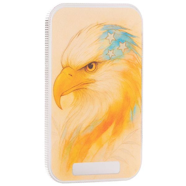 With a delicate palette of yellows and golds, this silver bar features a soft, almost dreamlike portrait of a bald eagle. The fine strokes and sun-washed tones lend it a painterly calm, giving America’s fiercest symbol a rare moment of serene nobility.
