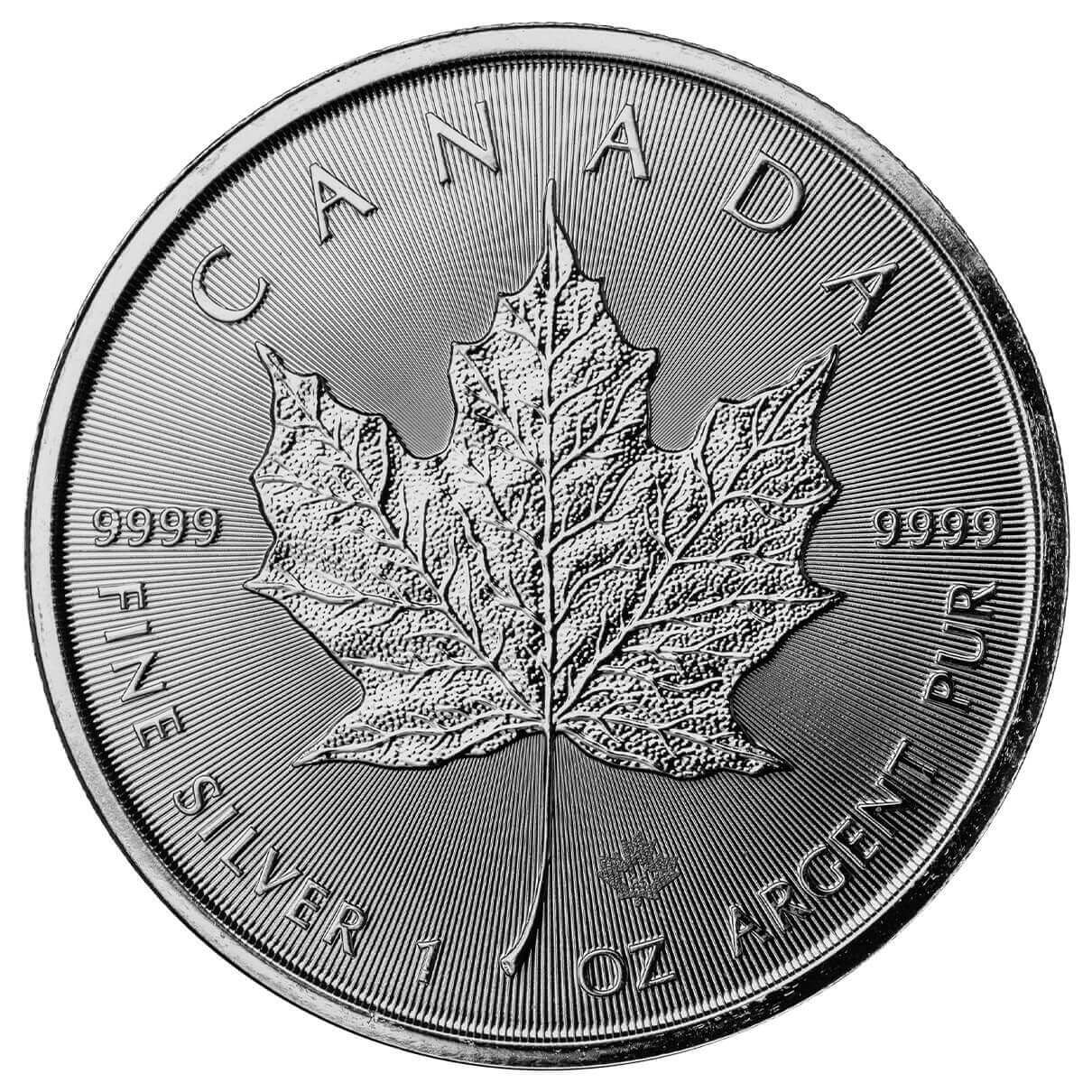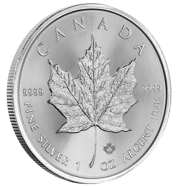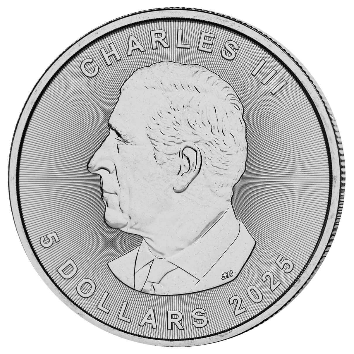 2025 Canadian Silver Maple Leaf 1 oz Coin (.9999 pure) (Brilliant Uncirculated). This is the official silver bullion coin of Canada. Since 1988, the coin has been minted by the Royal Canadian Mint. On the obverse is a portrait of King Charles III, while on the reverse is an image of a maple leaf; both vary in appearance year to year. Each coin is 1 troy oz with a purity of 99.99%, has a face value of $5 Canadian dollars, and includes the phrase "Fine Silver 1 oz. Argent Pur." This item is for one 1 oz coin.