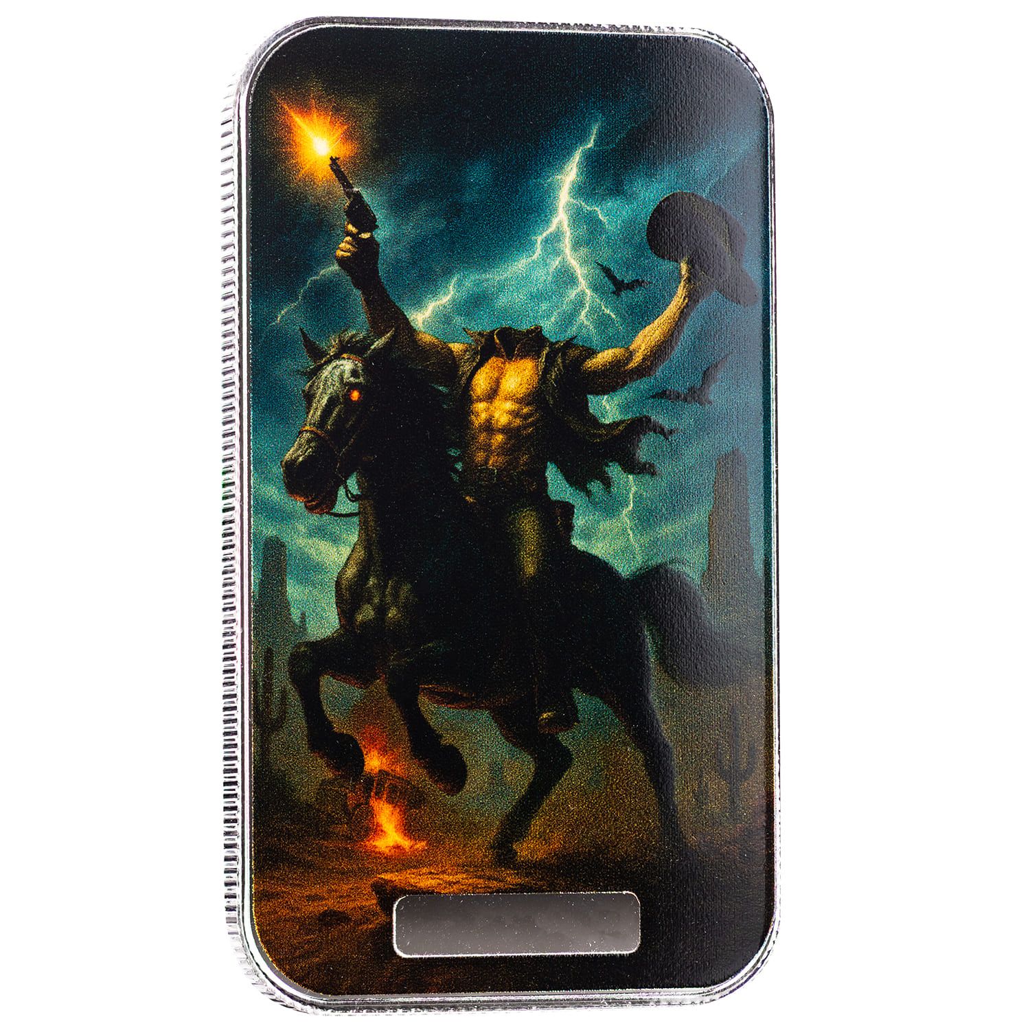 The 2025 Headless Cowboy 1 oz .999 Fine Silver Serialized Colorized Bar is the rarest piece of the Halloween Horror Collection. Featuring a fearsome headless rider galloping across a storm-lit desert, revolver raised high, this design captures the haunting blend of Western grit and supernatural terror.