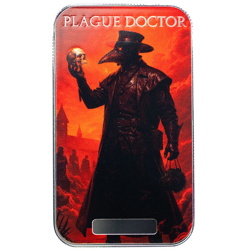 The 2025 Plague Doctor 1 oz .999 Fine Silver Serialized Colorized Bar embodies one of history’s most haunting figures. Featuring the shadowy silhouette of a medieval Plague Doctor, complete with his iconic beaked mask and flowing black cloak, this bar vividly portrays the eerie figure against a backdrop of red skies and a ghostly skull.