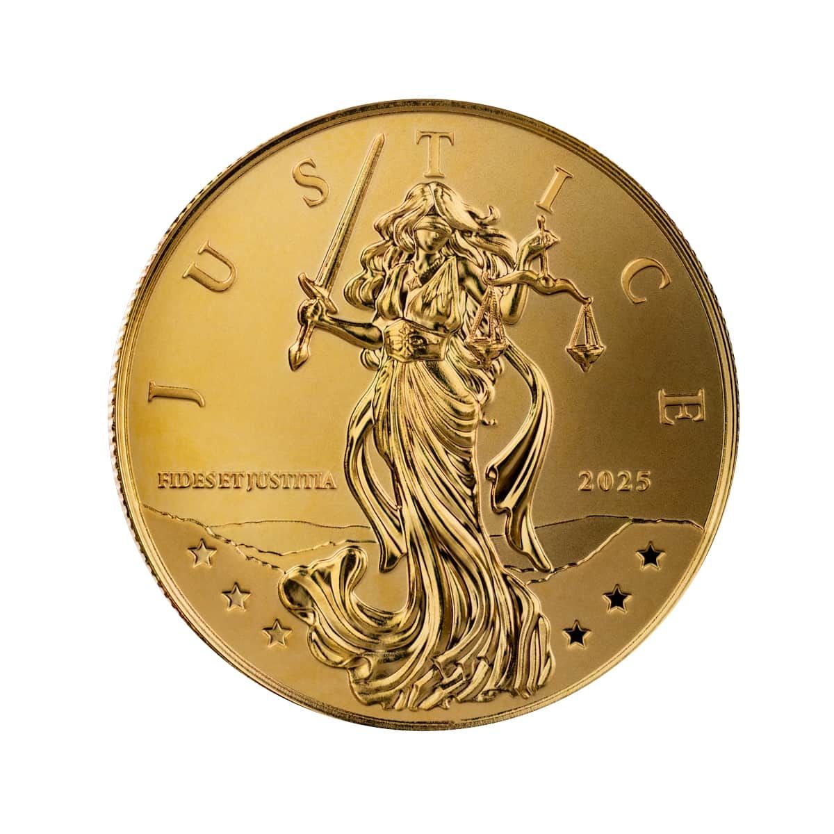 The obverse highlights the timeless figure of Lady Justice, a symbol of moral integrity and impartiality. She stands holding the sword of truth in one hand and the scales of justice in the other, her blindfold a representation of unbiased fairness. Surrounding her are the inscriptions “JUSTICE” and the Latin motto “FIDES ET JUSTITIA” (Faith and Justice). The year of issue, 2025, is prominently displayed, while the intricate background stars and linework add depth and brilliance to the design.