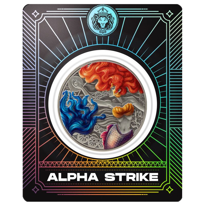 The reverse of the coin features the stunning mermaid in vivid detail, her fiery red hair and iridescent tail shimmering with vibrant color while she reaches for a radiant pearl. Contrasting blues and oranges create a sense of movement and magic, as though the coin itself were a window into an enchanted undersea world. The antiqued finish enhances the depth of the design, accentuating every swirl of water, strand of hair, and detail of the ocean’s coral backdrop. On the obverse, the official Samoa coat of arms affirms its authenticity and government-backed legal tender status.