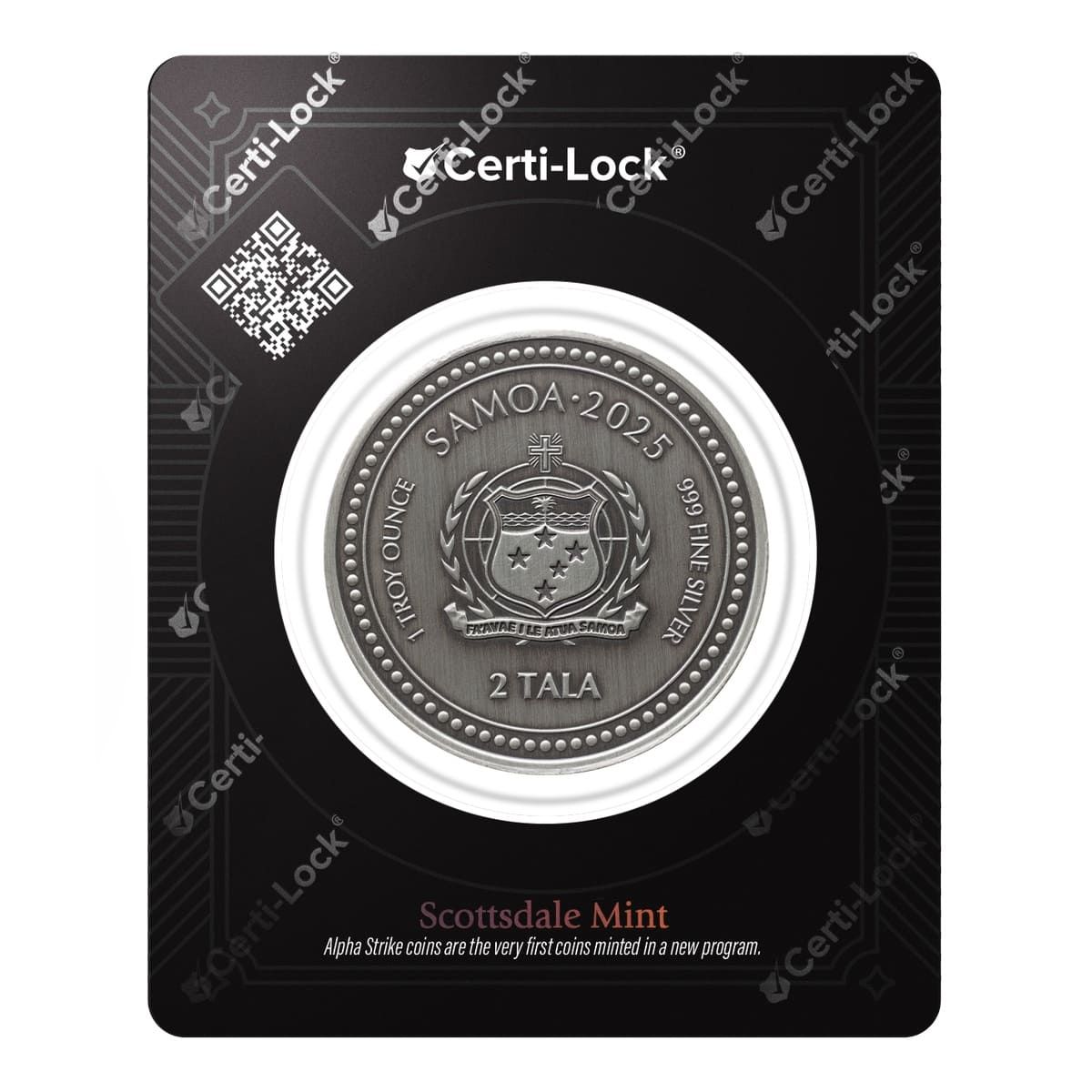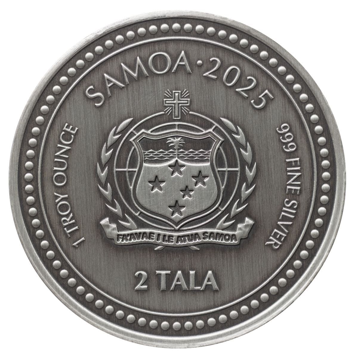 The reverse features the national emblem of Samoa alongside inscriptions confirming 1 Troy Ounce, .999 Fine Silver, and the official 2 Tala denomination. The darkened, textured surface created by the antiqued finish intensifies the coin’s contrast and artistic depth while maintaining formal sovereign presentation. With only 49 coins produced, this release stands out as one of the most limited modern Samoan silver issues—ideal for collectors targeting rare mintage silver, specialty finishes, and uniquely crafted bullion pieces.