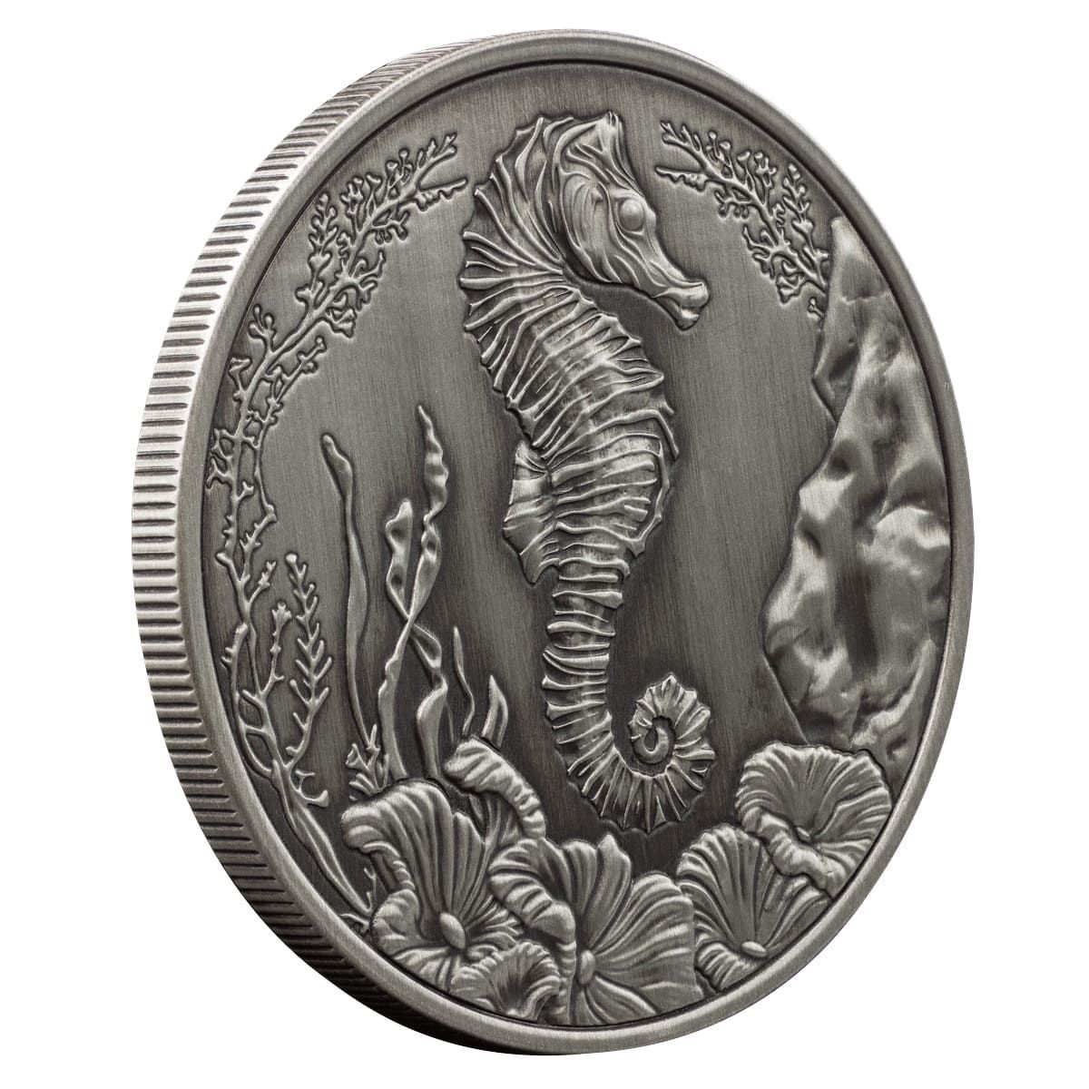 Each coin comes securely protected in a capsule mounted on chipboard packaging, offering durability, presentation value, and retail-ready display. Collectors searching for antiqued silver coins, premium 1 oz .999 silver, or special-finish bullion will find this release especially appealing. The tactile, historic feel of the antiquing pairs perfectly with the underwater theme, giving the series a collectible depth that expands beyond traditional bullion styling.