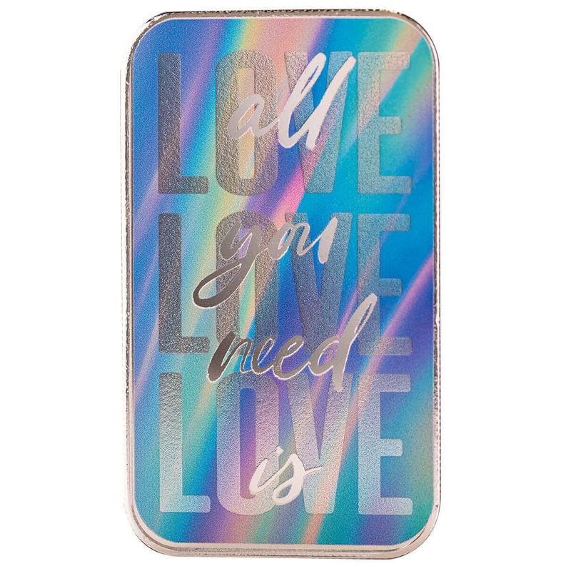The All You Need is Love 1 oz Silver Color Bar features a serene blue background with the word LOVE stacked vertically three times in bold, eye-catching letters. Elegantly layered across these repeating words, the phrase “all you need is” is written in flowing cursive script, adding a touch of romance and sophistication to the design. The combination of vibrant colors and polished silver creates a harmonious balance, making this bar a beautiful symbol of timeless affection and a perfect keepsake for any occasion celebrating love.