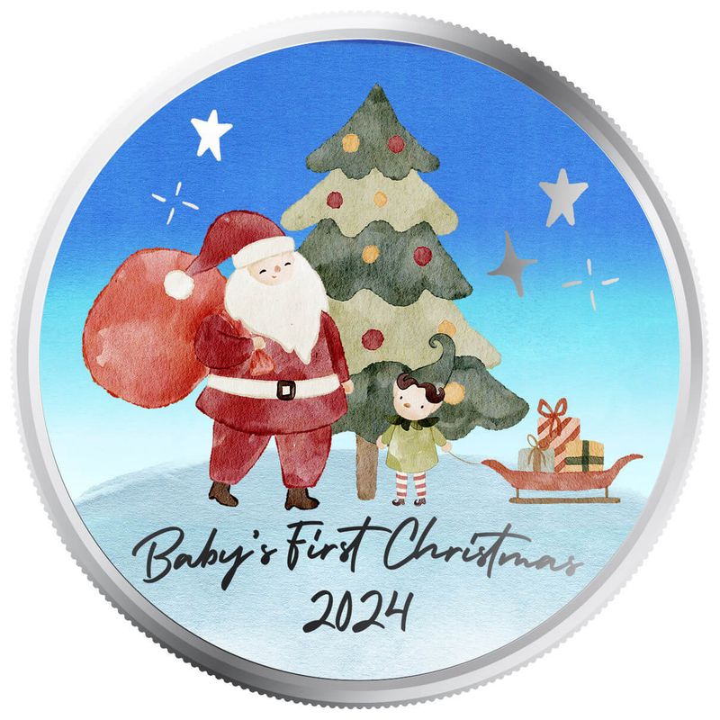 Crafted in 1 oz of pure silver, this round sparkles with festive colors and delightful details, making it a perfect keepsake for parents, grandparents, and families to cherish. From the twinkle of the Christmas tree to the joy in Santa's smile, this round brings the wonder of Christmas to life, celebrating a baby's very first holiday season.