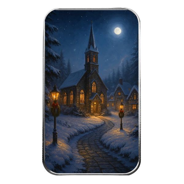 Celebrate the warmth and beauty of the holiday season with the Christmas Eve Chapel – 2025 1 oz .999 Fine Silver Bar. This timeless design captures a peaceful snow-covered village illuminated by the golden glow of a chapel on Christmas Eve. Gentle lanterns light the cobblestone path while the moon shines above, creating a serene winter night that perfectly reflects the stillness and reverence of the season.
