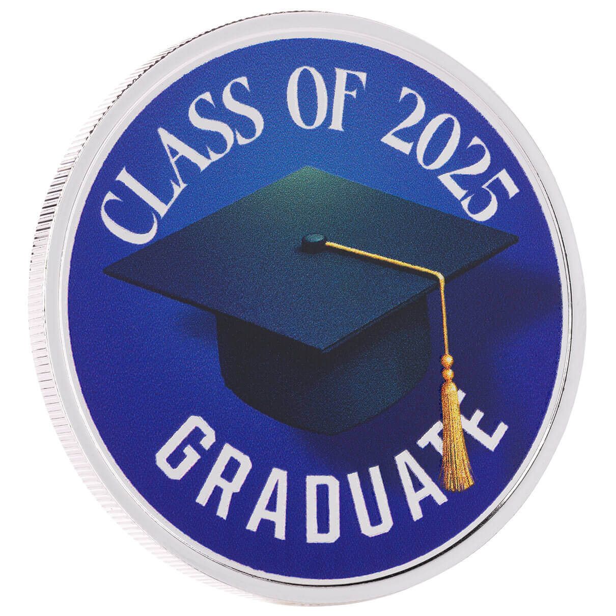 This classic silver round showcases a bold navy background and matching graduation cap, paired with the words “Class of 2025 Graduate.” The deep, rich tones give the design a sleek and dignified look, making it a timeless tribute to academic success. A meaningful keepsake for graduates of all levels, this round marks the moment with elegance and pride.