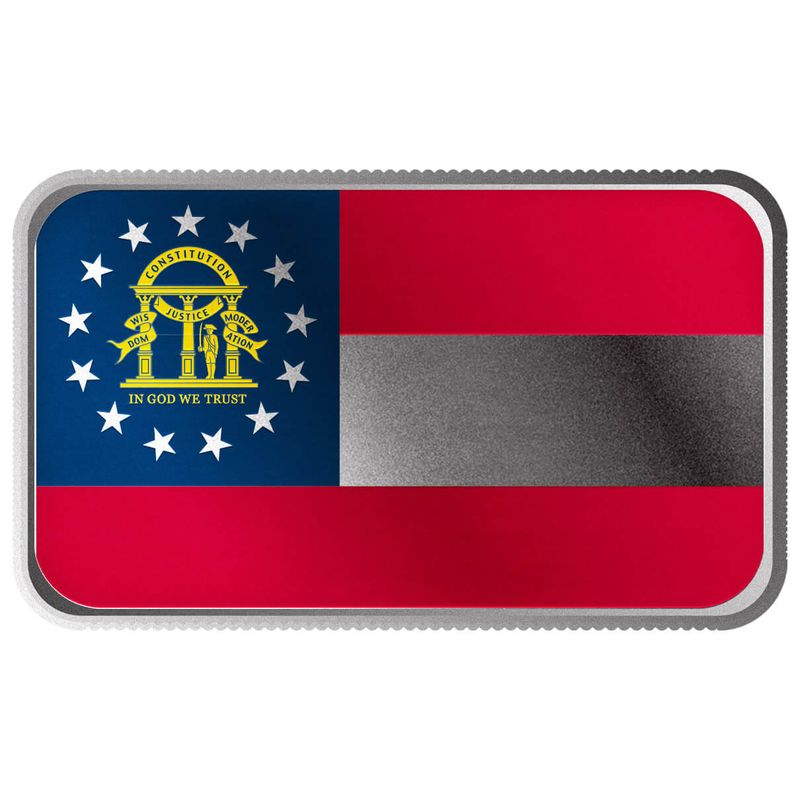 The flag of Georgia, known as the "Georgia State Flag," features a meaningful and historic design. It consists of three horizontal stripes: red, white, and red. In the top left corner of the flag is a blue canton with a circle of thirteen white stars, symbolizing Georgia as one of the original thirteen colonies. Inside the circle is the state's coat of arms, which includes an arch symbolizing the state's constitution, supported by three pillars representing the three branches of government. Wrapped around the pillars is a banner with the state motto, "Wisdom, Justice, Moderation." Standing guard is a figure of a soldier, representing defense of the constitution. The flag in its current form was officially adopted on May 8, 2003, and it represents Georgia's rich history, governance, and principles.