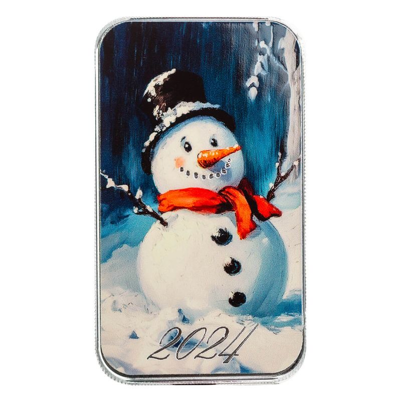 This Snowman brings a heartwarming touch to the holiday season with its playful, wintery design. This charming bar features a friendly snowman, complete with a top hat, scarf, and carrot nose, standing amidst a snowy wonderland. Struck from 1 oz of pure silver, it combines festive artwork with the timeless beauty of silver. Perfect for spreading holiday cheer, this collectible makes an ideal gift or a delightful addition to any winter-themed collection. Celebrate the magic of winter with this joyful and frosty keepsake, designed to capture the essence of the season