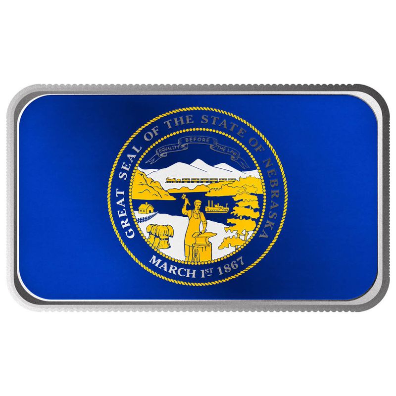 The flag of Nebraska, known as the "Nebraska State Flag," features a striking and symbolic design. It consists of a deep blue field with the state seal prominently displayed in the center. The seal depicts a detailed scene of a blacksmith working at an anvil, symbolizing Nebraska’s industrial and agricultural heritage. Above the blacksmith is a train, representing the state's pioneering spirit and transportation history. The seal also includes a sheaf of wheat and the state motto, "Equality Before the Law," reflecting Nebraska’s commitment to justice and fairness. Encircling the seal are the words "Great Seal of the State of Nebraska" and the year "1867," marking the year Nebraska was admitted to the Union. The flag was officially adopted on March 28, 1925, and it embodies Nebraska’s industrial roots, historical significance, and values.