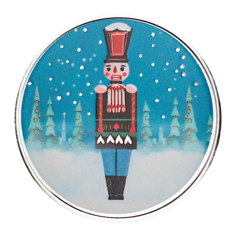 This 1 oz silver color round brings the classic holiday spirit to life with a vibrant depiction of a traditional nutcracker standing proudly against a snowy backdrop. Dressed in his regal uniform, complete with a bright red coat, gold trim, and tall black boots, the nutcracker stands at attention with a bold expression. Behind him, snow gently falls, blanketing the scene in a serene winter glow. The frosted landscape, dotted with snow-covered trees, enhances the festive charm, making this round a perfect symbol of holiday nostalgia and timeless tradition.