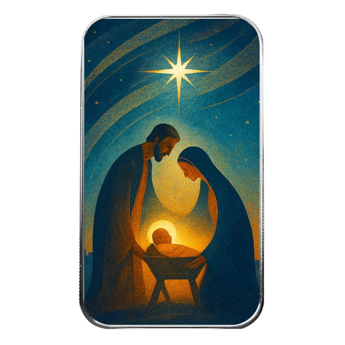 Celebrate the true meaning of Christmas with the O Holy Night – 2025 1 oz .999 Fine Silver Bar, a beautiful tribute to the birth of Christ and the everlasting message of faith, hope, and love. This inspiring design depicts the Holy Family gathered in quiet reverence around the infant Jesus beneath the radiant Star of Bethlehem. A soft golden light shines upon the manger, illuminating the humble beauty of that first Christmas night. Every detail — from Joseph’s gentle watch to Mary’s tender gaze — reflects the peace and holiness that define the season.