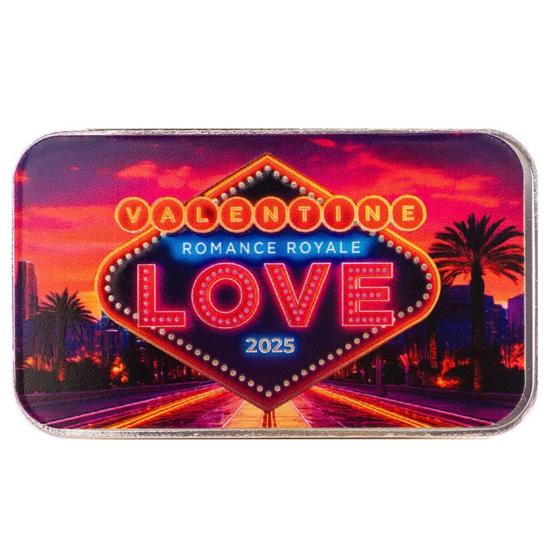 The Romance Royale 1 oz Silver Color Bar captures the glamorous allure of Las Vegas with a playful twist, featuring a vibrant depiction of the iconic Vegas sign. Below the sign, “Valentine” is elegantly displayed, followed by “Royale Romance” in a sophisticated script, and “LOVE” boldly emphasized in large, striking letters. The design combines the glitz and excitement of Vegas with a romantic flair, making it the perfect keepsake for those celebrating love in a grand way. This bar is a fun and luxurious tribute to romance, ideal for Valentine’s Day or any occasion of affection.