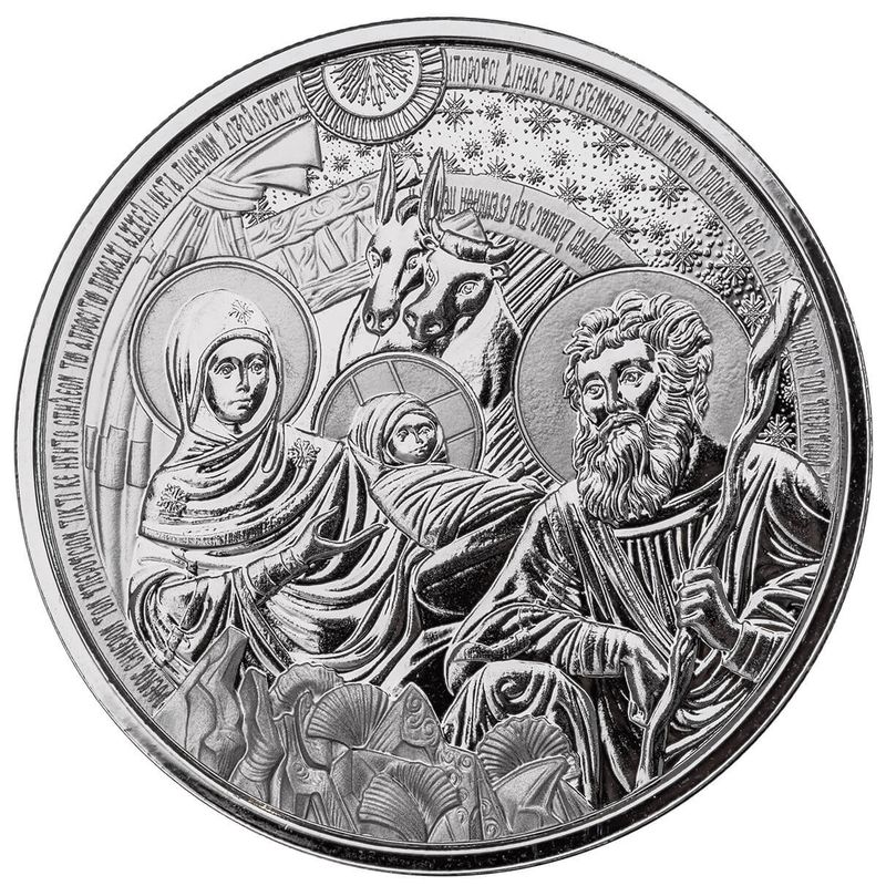 Along the rim, The Nativity coin bears a hymn with profound significance. In English, it beautifully expresses the miraculous birth: "Today, the virgin bears Him who is transcendent, and the earth presents the cave to Him who is beyond reach. Angels, along with shepherds, glorify Him. The Magi make their way to Him by a star. For a new child has been born for us, the God before all ages."