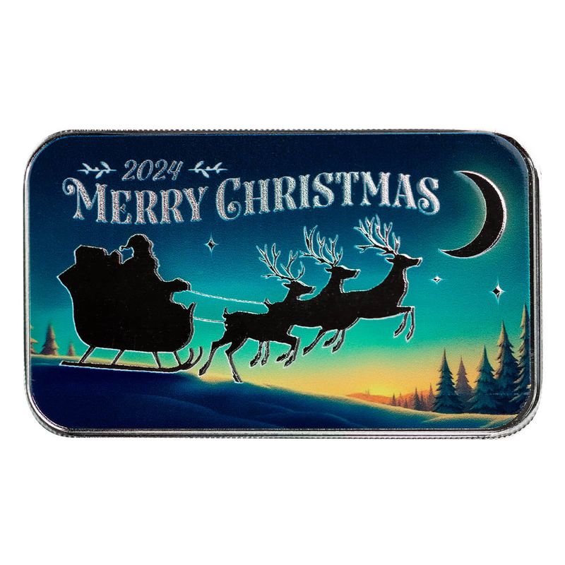 This bar captures the magical moment of Santa taking off with his reindeer into a stunning sunset sky. Against a backdrop of soft hues blending into warm oranges, the silhouette of Santa and his trusty reindeer evokes a sense of wonder and excitement as they embark on their Christmas journey. Snow all around them, adding a festive touch to this enchanting scene. Crafted from 1 oz of pure silver, this bar combines artistry with the precious metal, making it a perfect gift or collectible. Celebrate the spirit of the season with this delightful depiction of Christmas Eve magic!