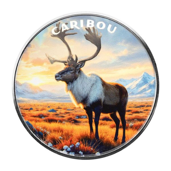 The obverse displays a caribou standing tall on open tundra beneath a brilliant sky. The colorization highlights its sweeping antlers and seasonal coat, celebrating the species’ endurance in harsh environments.