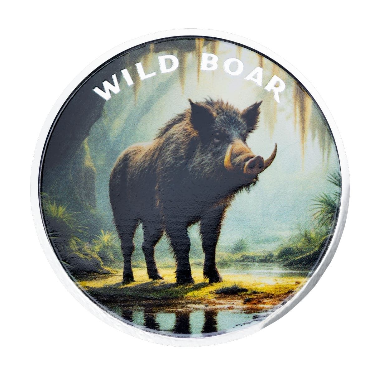 The obverse features a wild boar rendered in vivid color, standing strong in a forest clearing. The lifelike depiction highlights its tusks and rugged build, celebrating the species’ strength and untamed nature.