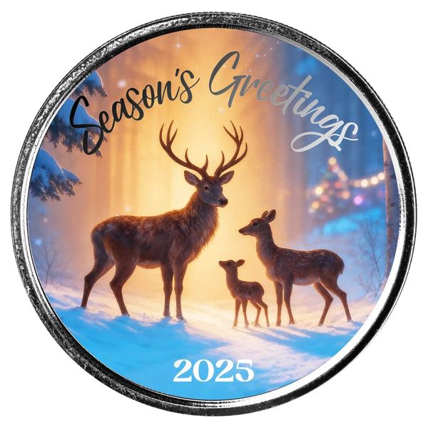 The Winter Deer Family – 2025 1 oz .999 Fine Silver Colorized Round is a heartfelt way to share the joy of the holidays. Perfect for families, collectors, and anyone who treasures the peaceful spirit of Christmas, it’s a timeless reminder that love and light shine brightest in the quiet beauty of winter.