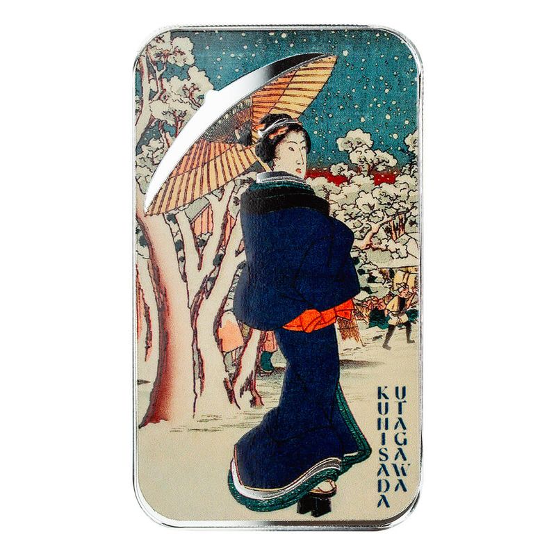 The Winter Geisha Bar captures the quiet elegance of a woman in a deep navy outfit, gracefully holding a traditional umbrella as snow gently falls around her. She gazes over her shoulder, exuding poise and serenity, while the delicate snowfall adds a sense of peaceful solitude to the scene. The intricate details of her attire and the umbrella evoke a timeless beauty, reflecting the harmony between nature and culture. Struck from 1 oz of pure silver, this bar is a stunning tribute to the grace and refinement of the geisha, making it a perfect addition to any collection.